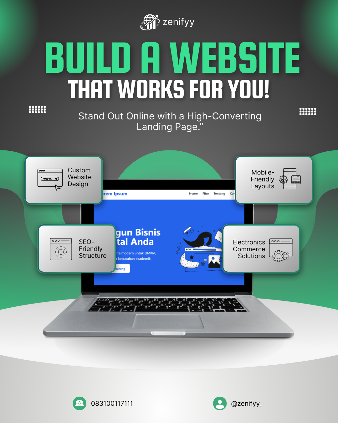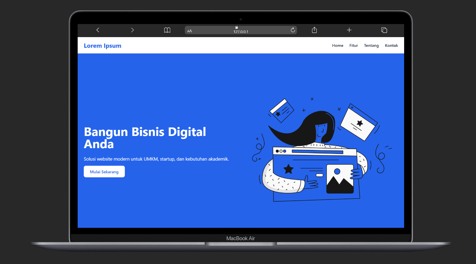 Layanan ini merupakan jasa pembuatan landing page sederhana yang ditujukan bagi UMKM dan personal brand yang membutuhkan media promosi dasar secara online. Landing page dibuat dalam satu halaman dengan desain responsif untuk perangkat mobile dan desktop, menggunakan template semi-custom yang disesuaikan dengan kebutuhan klien. Konten yang disediakan bersifat statis, meliputi profil singkat, informasi layanan, serta kontak. Paket ini mencakup satu kali revisi dan cocok bagi pengguna yang menginginkan tampilan profesional dengan biaya yang terjangkau.
